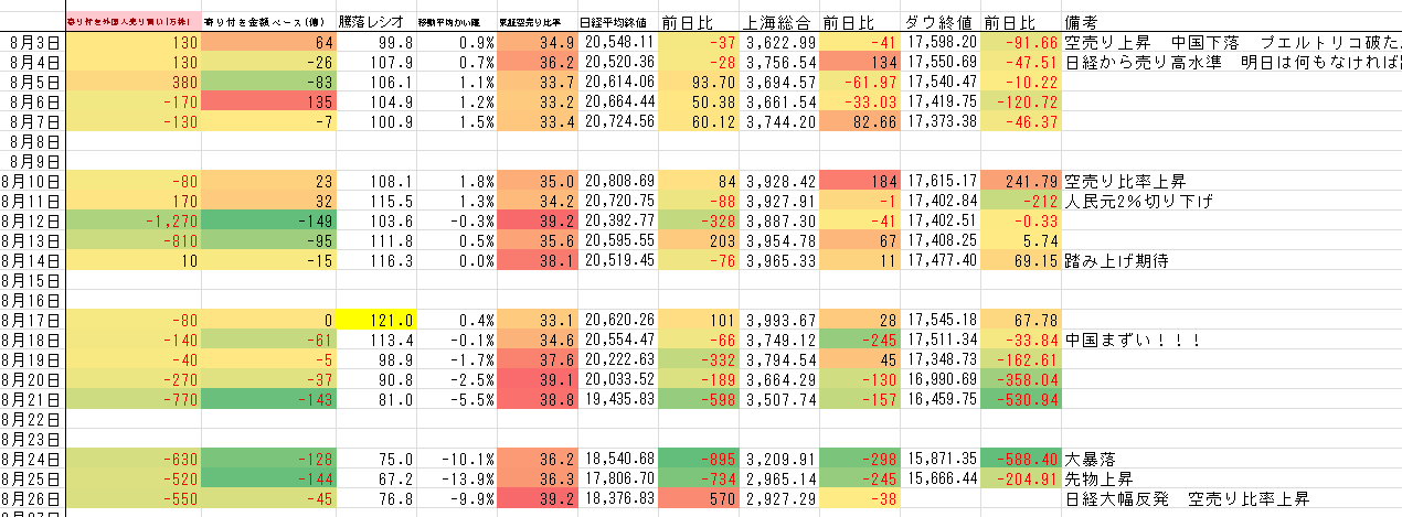 2015/08/26 - たか○さんの株式ブログ。タイトル:「やはり空売り比率がたまっている」 本文:空売り比率39.2%今度こそ踏みあげかいの?明日、ダウがおかしい動きをしなければ、強い相場になりそう。な気がするけど最近の相場はわからん。