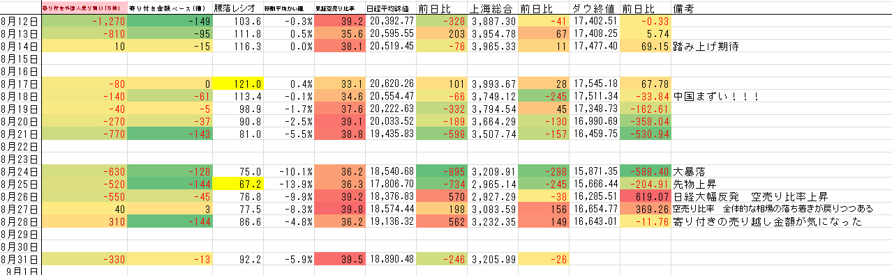 2015/08/31 - たか○さんの株式ブログ。タイトル:「データ集計したが・・・」 本文:どうにもこうにも少し不気味さを感じます。大きく下げた後の戻りの後の調整。ととらえれば単純ですが。しかしここ最近続く 寄り付き前の売り注文。そして、空売り比率の上昇。この二つが絡むと