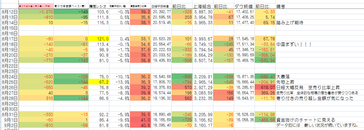 2015/09/02 - たか○さんの株式ブログ。タイトル:「データ」 本文:みると やはり外人寄り付きマイナスが続いてる。意識として 資金が抜けていく方向かな。これといった強いものがないしね。そもそも9月10月は落ちやすいんだっけ。空売り比率もこうなるとあまり