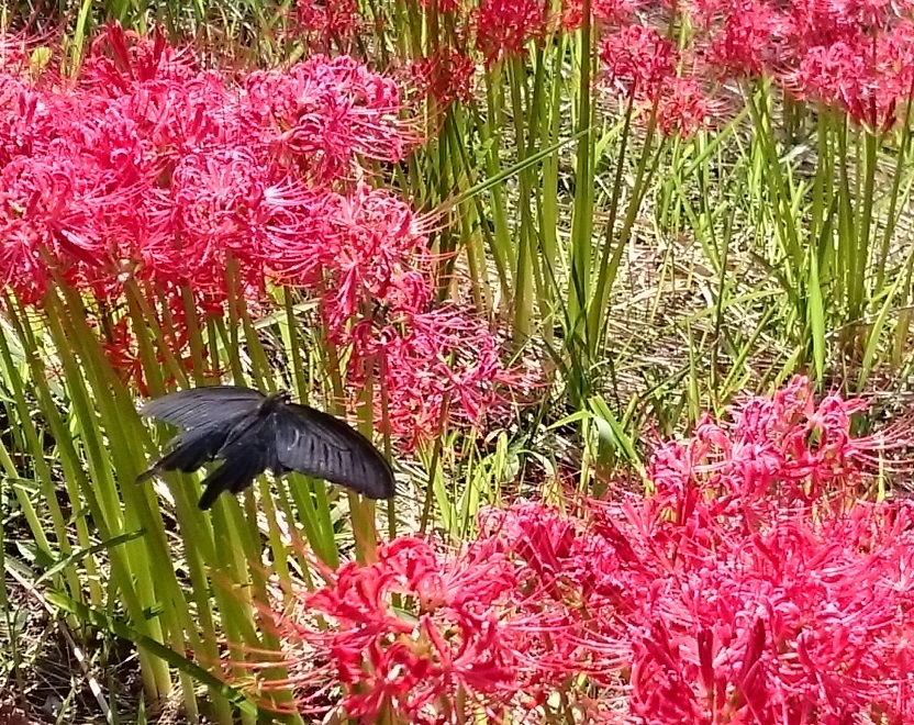 彼岸花にクロアゲハまだまだ、ツクツクボウシいます。