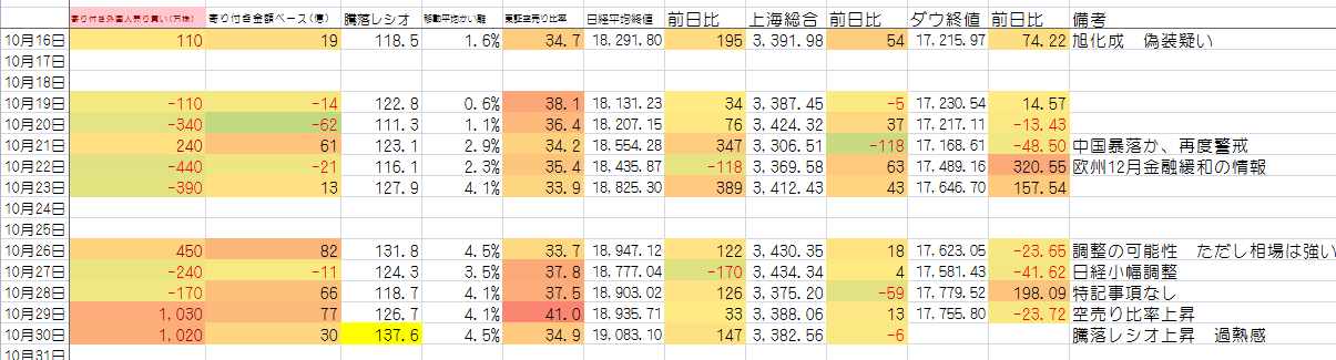 2015/10/30 - たか○さんの株式ブログ。タイトル:「騰落レシオ上昇も・・・」 本文:空売り比率下落 騰落レシオ上昇この組み合わせは 過熱感があるものの