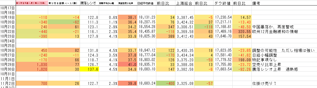2015/11/02 - たか○さんの株式ブログ。タイトル:「日記追記」 本文:もしも教科書通りいくならもう少し押すか ヨコヨコだろうなあ。けっこう過熱気味なのは変わらない。やはり押してきたってところ。久々に騰落レシオも137までいっていたし。落とせば落ちる状態でしたからね。