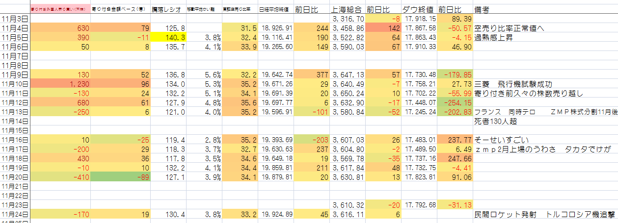 2015/11/24 - たか○さんの株式ブログ。タイトル:「くそ」 本文:ボケっとしていたら 投稿を忘れてた。うーむ。数値は何とも言えない状況。取りあえず少し押しそうなところまで来ているけど、強く押したらかってもよさそうな感じ?