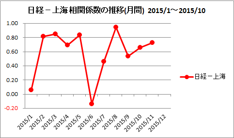 次は日経平均ー上海(総合指数)の月別の相関