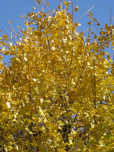 こっちはご近所のイチョウ。仕事に行くときに歩く八重洲通もイチョウ並木がありますが、まだ黄色くなっているのは少数派です。