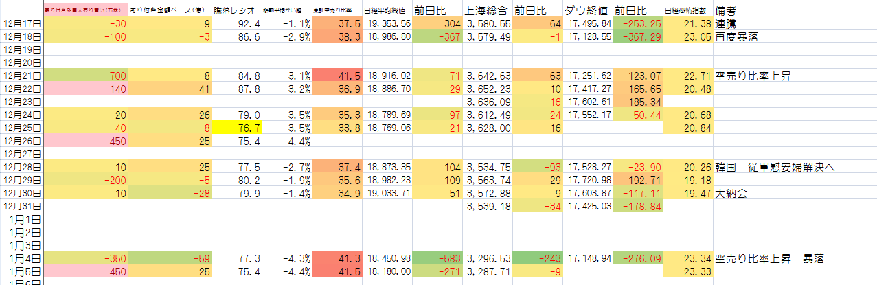 2016/01/05 - たか○さんの株式ブログ。タイトル:「数値更新」 本文:ここからはこれらの数値が重要になりますね。今日は徐々に仕込んでもいいところまで来ていますので 若干仕込みました。しかし先物は下げていますね。ここで一つ 気づきというか。とにかく