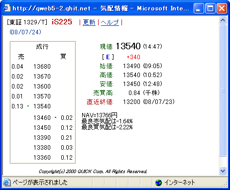 2008/07/24 - miyakenさんの株式ブログ。タイトル:「iシェアーズ日経225(1329) その4 」 本文:乖離が小さくなって、書くことがなくなっていたiシェアーズ日経225(1329)ですが、今日の大引は大きな乖離となりました。 これだけの乖離はかなり久しぶりだと思います。