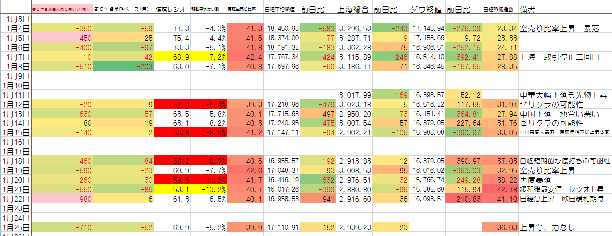 2016/01/25 - たか○さんの株式ブログ。タイトル:「データ集計」 本文:この数値の組み合わせは また売り越されてるけど 空売りは少し減ってる。正直微妙だ。売り越しがそこそこでかめだ。様子見だね。あまりさえない動きが続きそうだね。