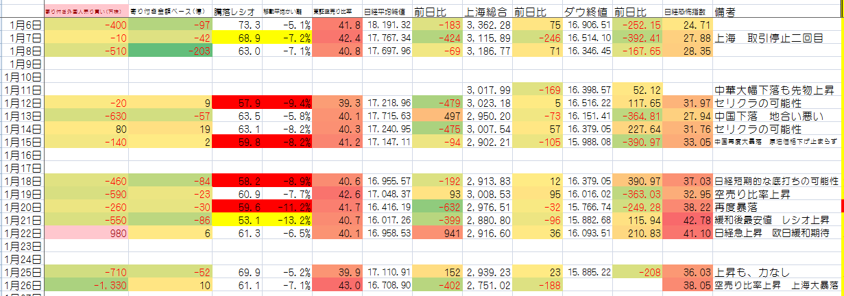 2016/01/26 - たか○さんの株式ブログ。タイトル:「こんな状況で上がるはずがない」 本文:データ集計しましたが。これは改めてみるとひどい。ただ日経が下がった、と見れば簡単にひどい下落だで済むけどこの数値を見ていると吐き気がしてくる。寄り付きの大売り越しの連発。空売り比率は常に高い数値。騰落