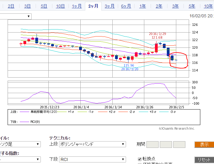 2016/02/05 - たか○さんの株式ブログ。タイトル:「為替のポリバンが」 本文:為替のポリバン見ると 反転しそうに見えなくもないけど -2のところにちょうどトリガー価格が来てる。きもちわりー。これたまたま?偶然にしちゃできすぎっぽい。今夜が峠か。