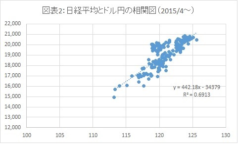 2016/02/16 - 株式市場独り言さんの株式ブログ。タイトル:「日経平均とドル円レートの関係」 本文:<独り言>画像にある図表は日経平均とドル円の値をそれぞれ取ったものだが、図表1は株価上昇期間を含める2014/1から、図表2は2015/4からのデータから作成されている。気になるポイントは以下の通り。