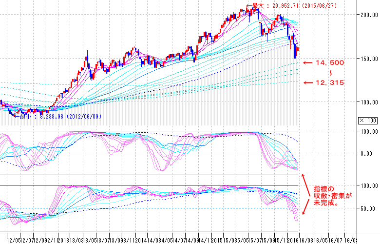チャートから見えてくる底値の範囲は、日経平均は14,500円~12,315円