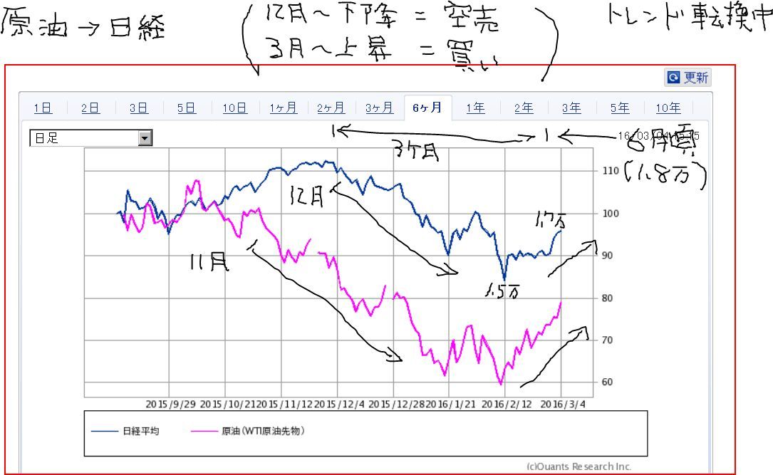 2016/03/05 - gomachan-2015さんの株式ブログ。タイトル:「先行指標、トレンド転換中♪ 《カラ売り⇒買いへ》」 本文:★日経平均の先行指標は、いろいろと考えられます。数か月サイクルの循環も有り。 怪しいと思っていたWTI原油と日経平均のチャートを重ねて見ると、 原油こそが先行指標ではないかと