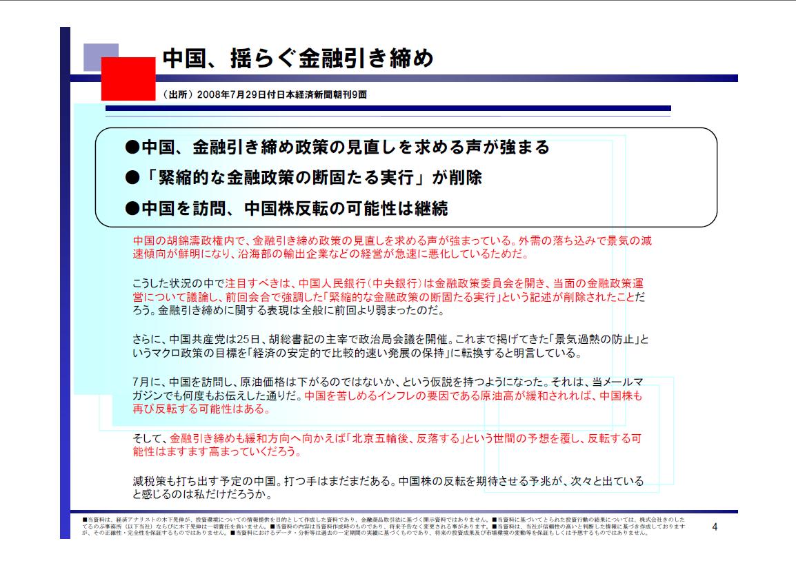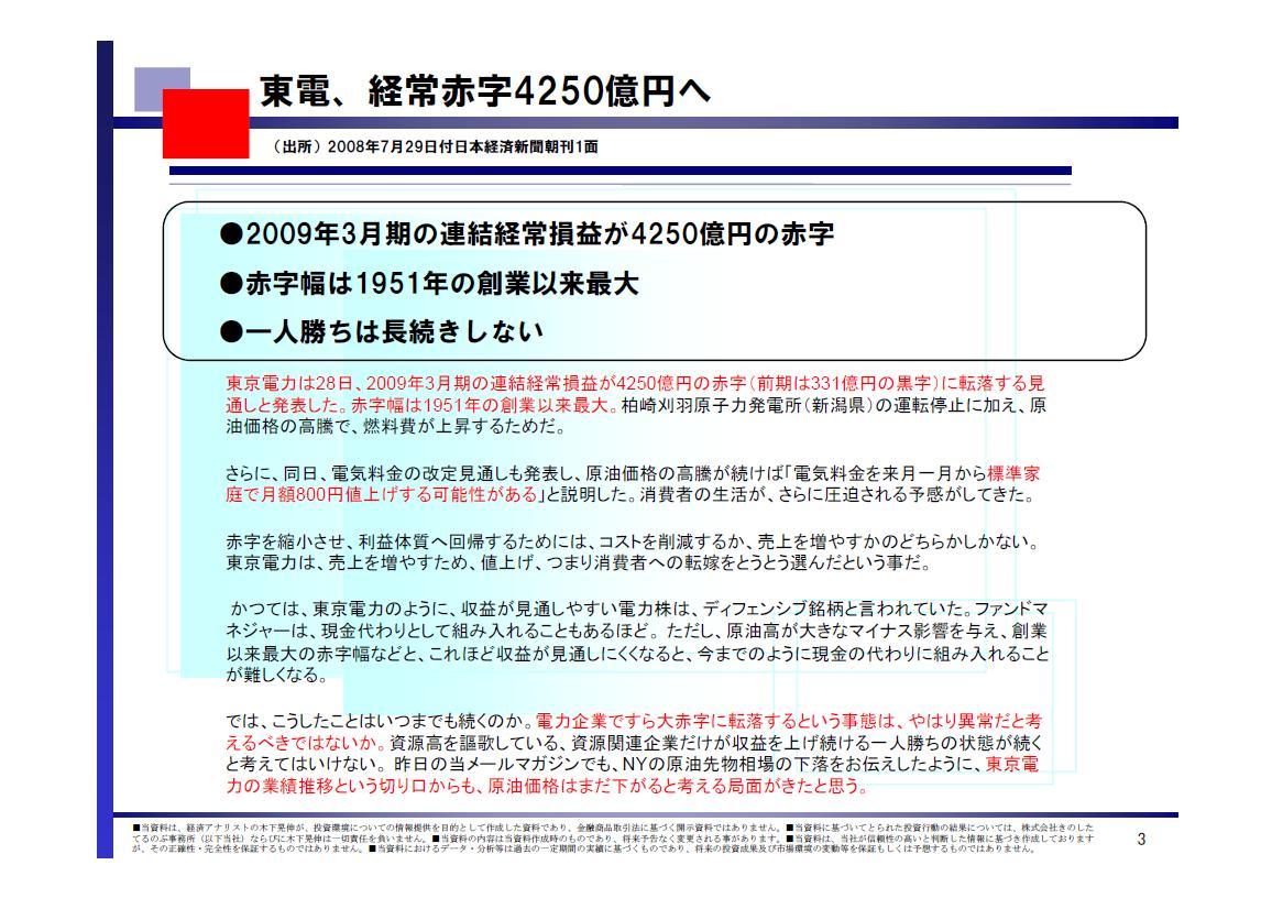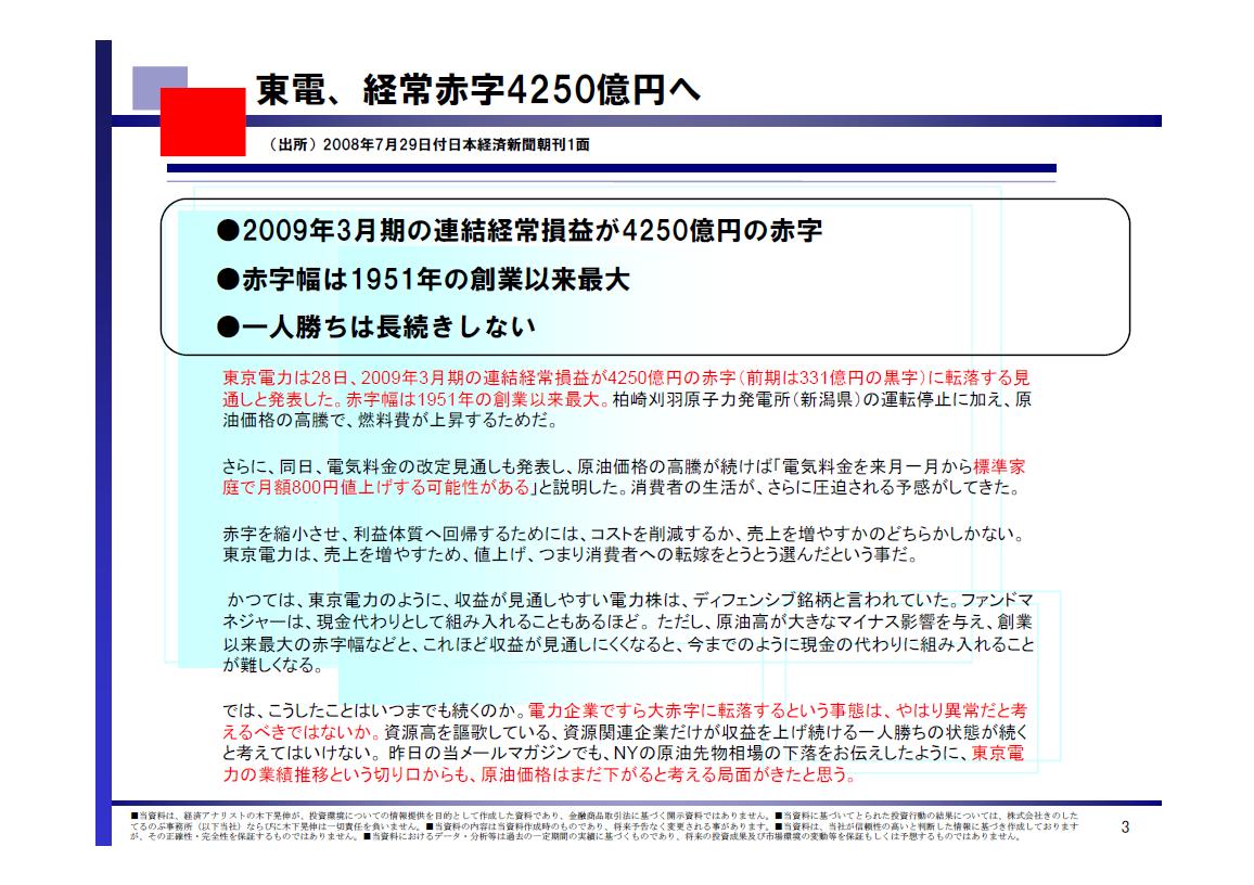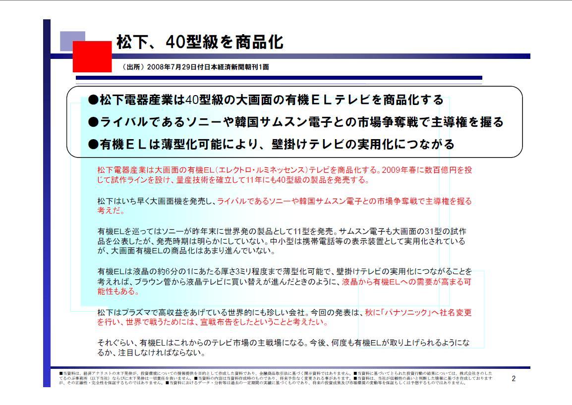 2008/07/30 - 木下 晃伸さんの株式ブログ。タイトル:「【投資脳のつくり方】松下、40型級を商品化」 本文:みなさま、いかがお過ごしでしょうか。 経済アナリスト、木下 晃伸(きのした てるのぶ)です。 ●一喜一憂 不安定な状況が続きます。 IMF(国際通貨基金)が金融危機の懸念が残る、