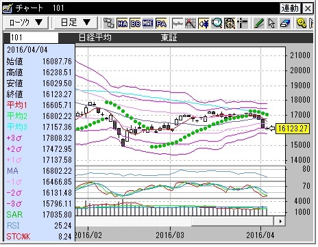 日中に注目される指標が公表されるわけではないので、現在マイナス2σの水準にある日経平均はこれ以上大幅に下がるということは想定していない。