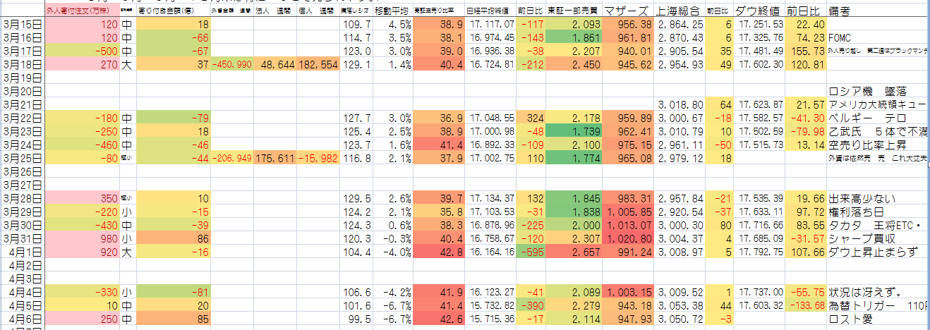2016/04/06 - たか○さんの株式ブログ。タイトル:「数値更新」 本文:数値の流れをみると 寄り付き前はいい傾向見ればわかるって話だけど トータルで今週は買い越し。あくまで寄り付きだけど。期になるのは空売り比率。今日は空売り比率下がると思ってたけど