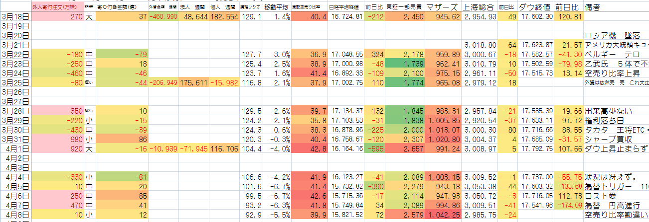 2016/04/08 - たか○さんの株式ブログ。タイトル:「データ集計」 本文:どうやら このまま 何もなく上昇と行くかは 暗雲ですね暗雲。あうん あうん 追記 空売り比率は修正しました。↓空売り比率 42.8もある。素人 個人があの場面で売れたか。わかりませんが