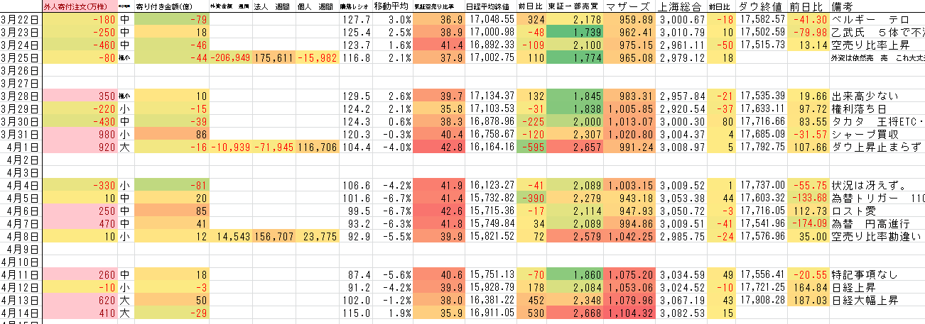 集計した数値を見ていると、やはり3月末は日銀短観や GPIFの収支を出せない状況などから売り越し入ったものの 4月は再度買い越しに回ってる。年金で際限なく買い続けるパターン?