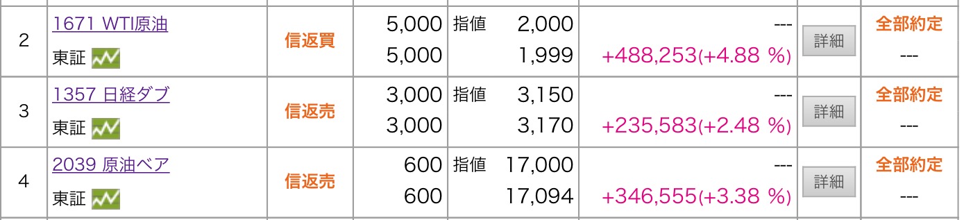 原油ETFショートと原油ベアロング、美味しく利確致しました!