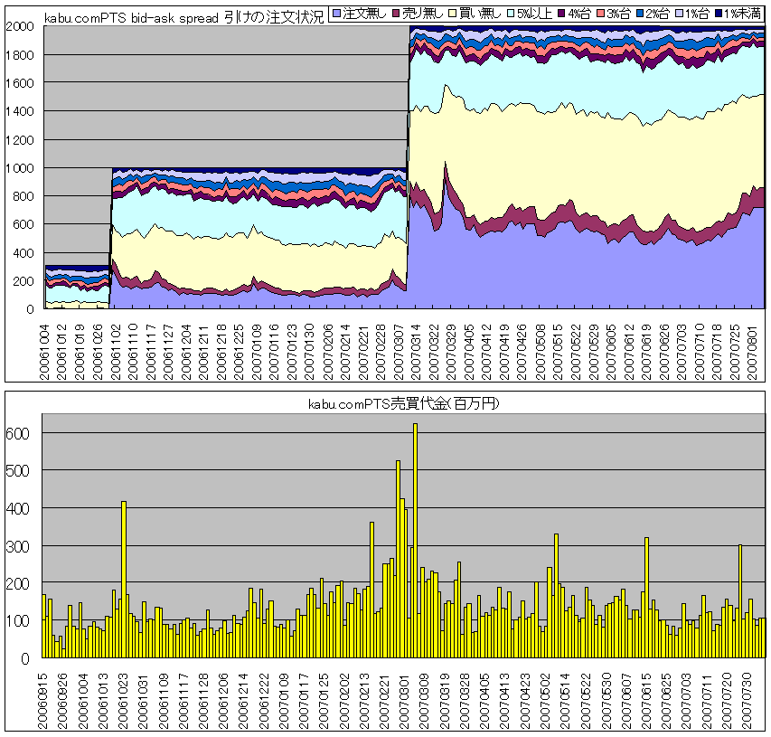 2007/08/04 - miyakenさんの株式ブログ。タイトル:「kabu.comPTS ~2007/8/3」 本文:グラフは、夜間取引kabu.comPTSの初日からの売買代金と2006/10/4以降の引けの注文状況の記録です。
