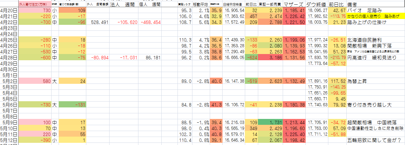 2016/05/12 - たか○さんの株式ブログ。タイトル:「データ集計」 本文:うーむ。特になし。上でも下でもない感じかなあ。力を感じないね。こういう相場久々だねー。