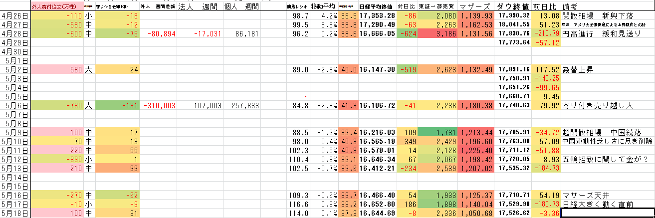 2016/05/19 - たか○さんの株式ブログ。タイトル:「新興大荒れ 日経は上昇」 本文:これ今日もかなあ。普通の考え方だと この辺で反転するだろうと思いたいけどマザーズは依然1000円オーバーの高値。下げ余地はまだまだある。魚の寄り付く銘柄でデイトレで行きますか。