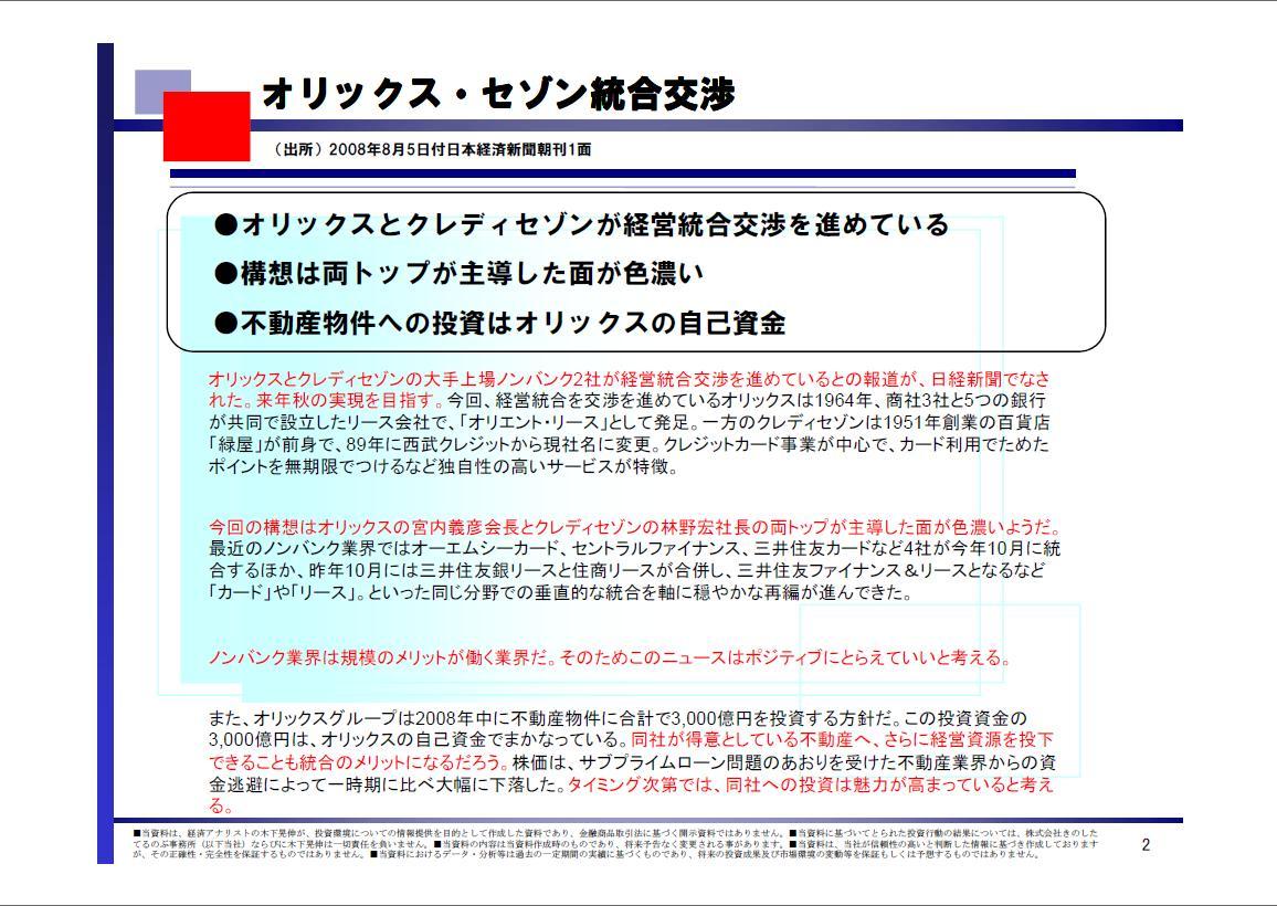 2008/08/06 - 木下 晃伸さんの株式ブログ。タイトル:「【投資脳のつくり方】オリックス・セゾン統合交渉」 本文:みなさま、いかがお過ごしでしょうか。 経済アナリスト、木下 晃伸(きのした てるのぶ)です。 ●オリックス 10年以上研究してきたオリックス。