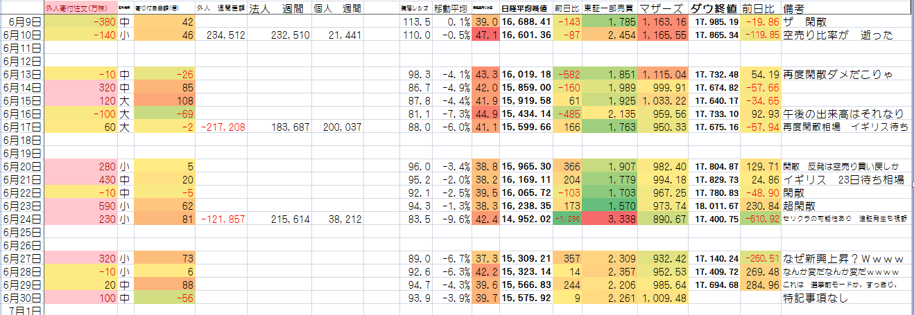 2016/06/30 - たか○さんの株式ブログ。タイトル:「データ」 本文:ふーむ。外人は 先週は資金抜いてきてる。年金が結構買いに回ってたとこ二の下落なのか。いくら損してんだろう。データ的に特記事項はなし。明日は今日と同じ環境だけど