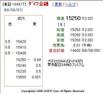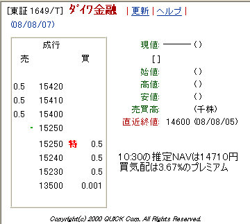 2008/08/07 - miyakenさんの株式ブログ。タイトル:「ダイワTOPIX-17金融(除く銀行) の板が動かない」 本文:今日のダイワTOPIX-17金融(除く銀行) (1649.T)は、ザラ場の気配値が動きませんでした。