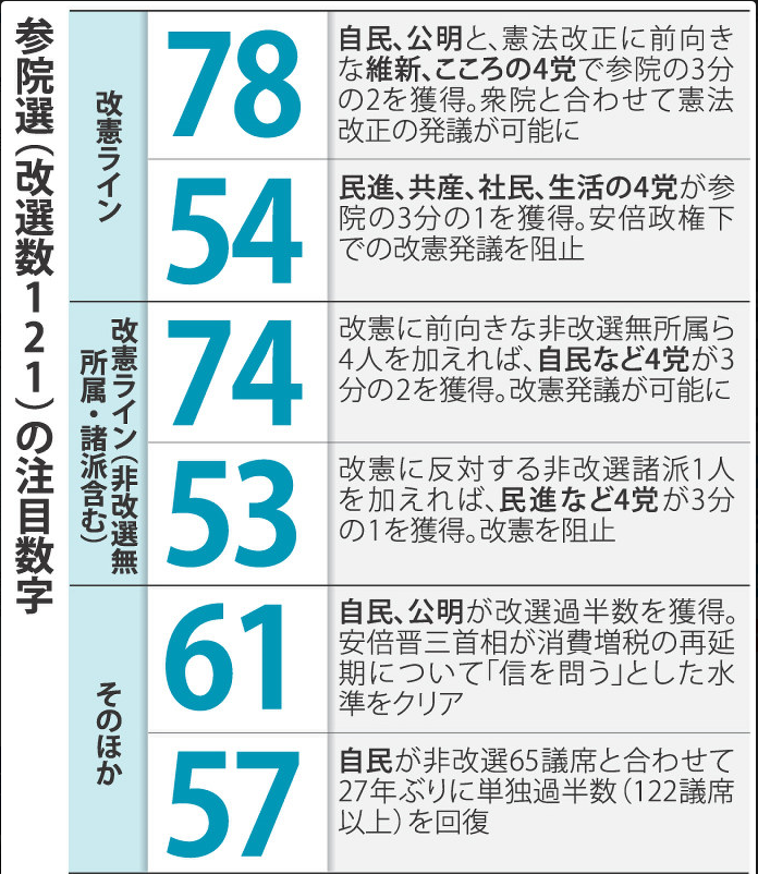 2016/07/09 - 夢想人さんの株式ブログ。タイトル:「政権左右「改憲ライン」、焦点となる数字は…」 本文:(毎日新聞感想です)http://mainichi.jp/senkyo/articles/20160709/k00/00m/010/248000c(要約・引用)■改憲発議には定数242の3分の2(16