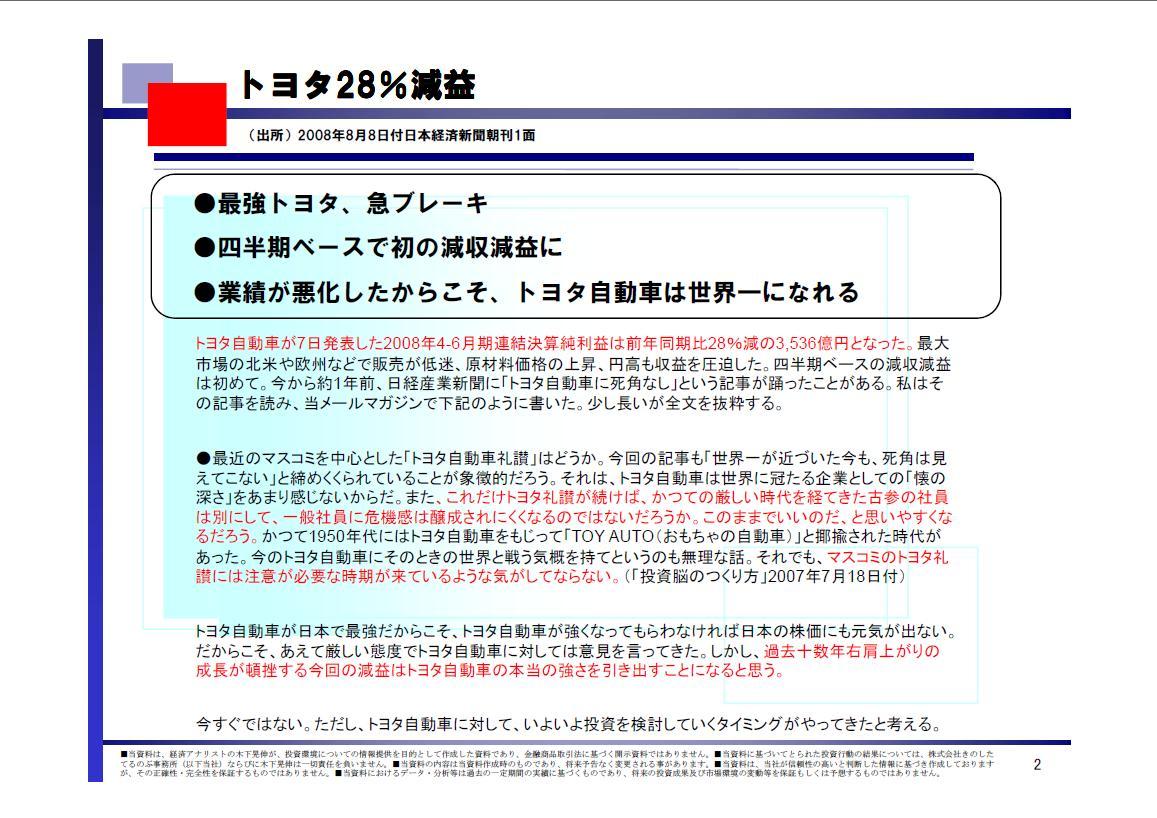 2008/08/08 - 木下 晃伸さんの株式ブログ。タイトル:「【投資脳のつくり方】トヨタ28%減益」 本文:みなさま、いかがお過ごしでしょうか。 経済アナリスト、木下 晃伸(きのした てるのぶ)です。 ●8のつく日 8というのは私の地元、名古屋という印象があります。