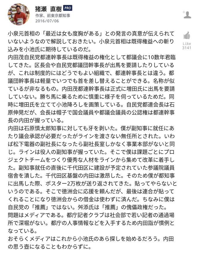 元東京都知事の猪瀬さんのツイートが話題になってますね。