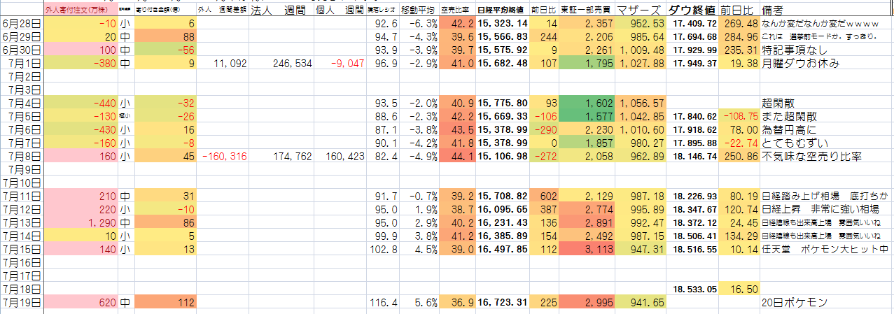 2016/07/19 - たか○さんの株式ブログ。タイトル:「まだまだ軸は上か」 本文:データ集計。まだまだ相場の流れは変わってなさそうだね。押したら買いで十分だ。強い買いの力がまだ続いてる感じ。下手に売りで入ると痛い目見るかもしれないね。あすも 任天堂関係で