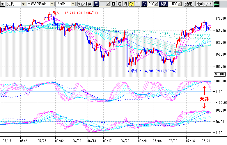 2016/07/22 - tensokoさんの株式ブログ。タイトル:「日経戻り天井」 本文:7月8日の底値から、約2週間に渡って上昇し続けてた日経株価ですが、21日の高値で、戻り天井を形成した模様です。『天底チャート』で、今回の底値から天井までの状態を1時間足と4時間足にて、確認してみましょ