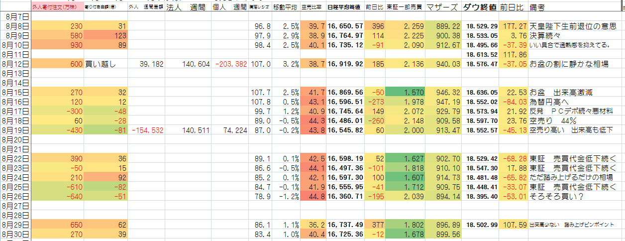 2016/08/31 - たか○さんの株式ブログ。タイトル:「!!!!」 本文:なんだこの相場今度はカラ売り比率が上がってる。しかも売買代金は超少ない。明日も踏み上げピンポイントか。これが相場の力だと思うとやられるし、逆に弱い相場と決めつけてもやられる。絶妙に変な相場だね。買いに
