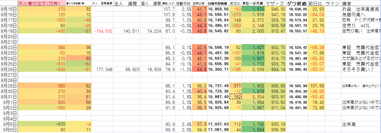 2016/09/06 - たか○さんの株式ブログ。タイトル:「出来高さらに減少」 本文:不穏ですね。不穏。ただ、こういう相場って 上昇を続けてたからには 多少ドンと出来高が上がらんとトレンド転換しないような気もしなくもない。しかし、この下がりっぱなしの