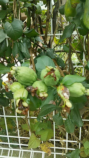 わが家に小さいけど木瓜(ボケ)があって、2月くらいから赤や白の花が咲きます。数年前から実がなるようになり、毎年1~2個の実をつけるのですが、ことしは写真のように豊作なようです。
