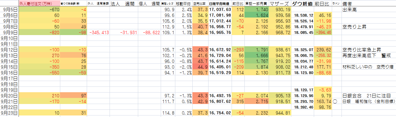 2016/09/23 - たか○さんの株式ブログ。タイトル:「データ集計」 本文:つかみどころがない感じ。特にこれって感じがない。しいて言えば 空売り比率が 下落した。先物が一気に下がった後