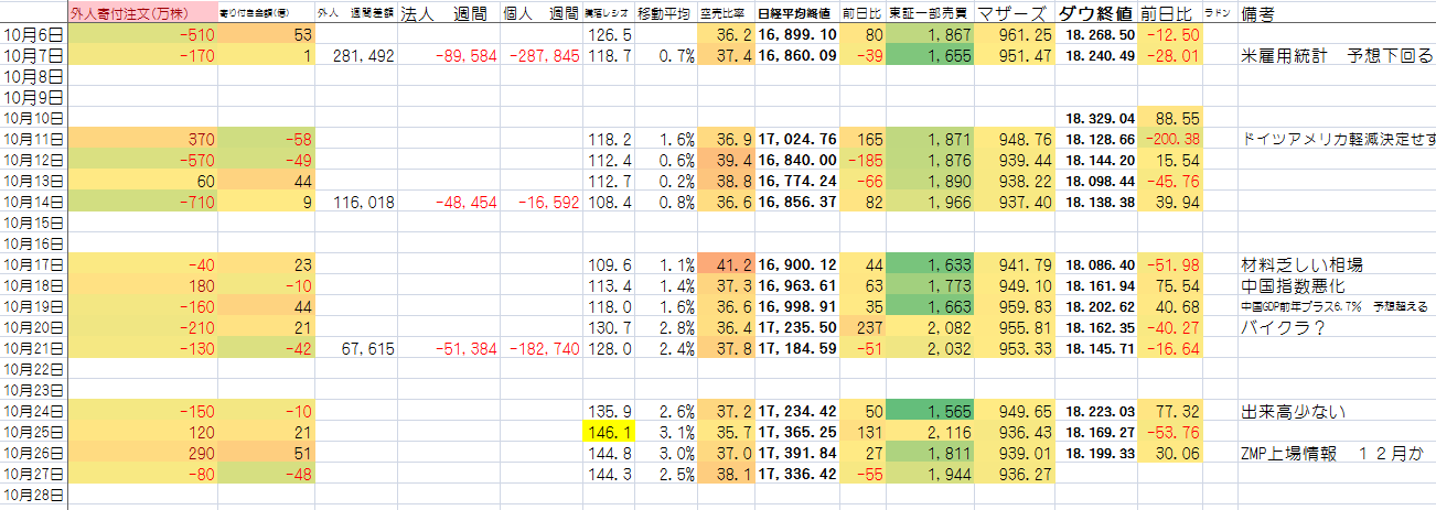 2016/10/27 - たか○さんの株式ブログ。タイトル:「データ集計」 本文:やはり 粘っこい相場ね。簡単には落ちないけれど 出来高がぐんと上がったり 大陽線を描いたりしたら 警戒だね。これでもかってくらいにレシオが上がったら 必然的に下がるでしょうね。