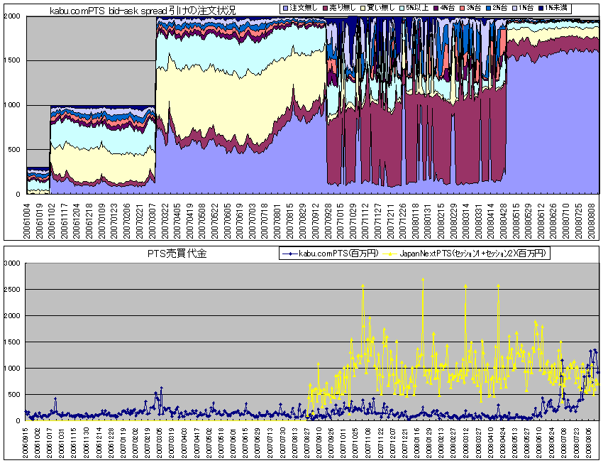 2008/08/16 - miyakenさんの株式ブログ。タイトル:「kabu.comPTS ~2008/08/15」 本文:kabu.comPTSの引けの注文状況と、売買代金のグラフです。 JapanNextPTSの売買代金は、推計値です。公式のものではありません。