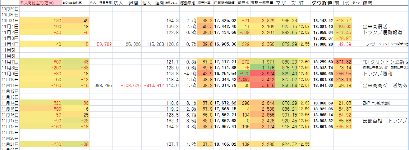 2016/11/21 - たか○さんの株式ブログ。タイトル:「データ集計」 本文:とくに 行き過ぎた過熱感はないか。一応過熱はしてるけどまだ、余裕ありそうね。クライマックス的な 上昇もなければ 調整もない。ただ