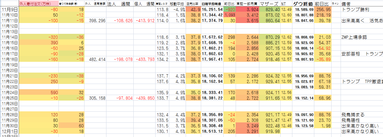 2016/12/01 - たか○さんの株式ブログ。タイトル:「更新 なんともはや・・・」 本文:これは 停滞ですね何とも言えない組み合わせ。出来高だけが光るが クライマックスというには・・・・小休止してるんかな。前週も