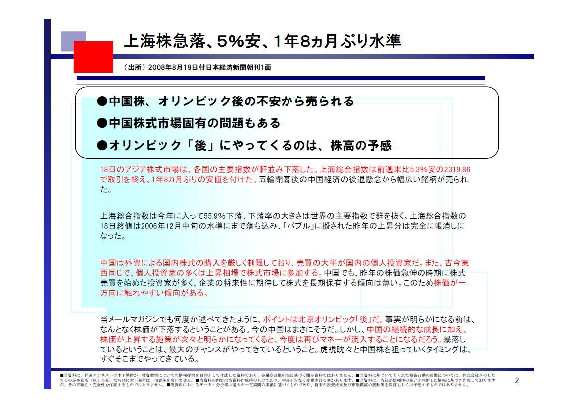 2008/08/19 - 木下 晃伸さんの株式ブログ。タイトル:「【投資脳のつくり方】上海株急落、5%安、1年8ヵ月ぶり水準」 本文:みなさま、いかがお過ごしでしょうか。 経済アナリスト、木下 晃伸(きのした てるのぶ)です。 ●世界株に振られる 昨日はアジア株の下落をカバーできたのですが・・・