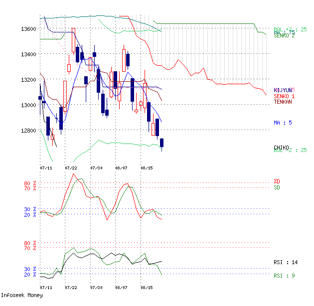 ・RSIは43と微妙だが来週の目標株価は雲と基準線の間の13000~13100円とします。