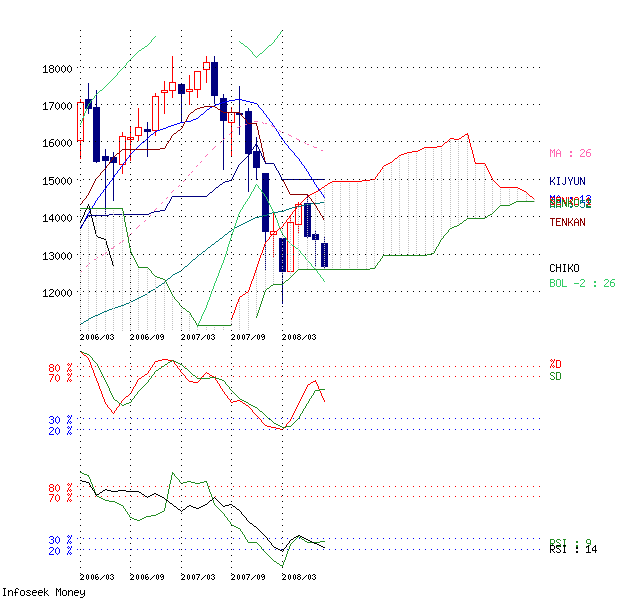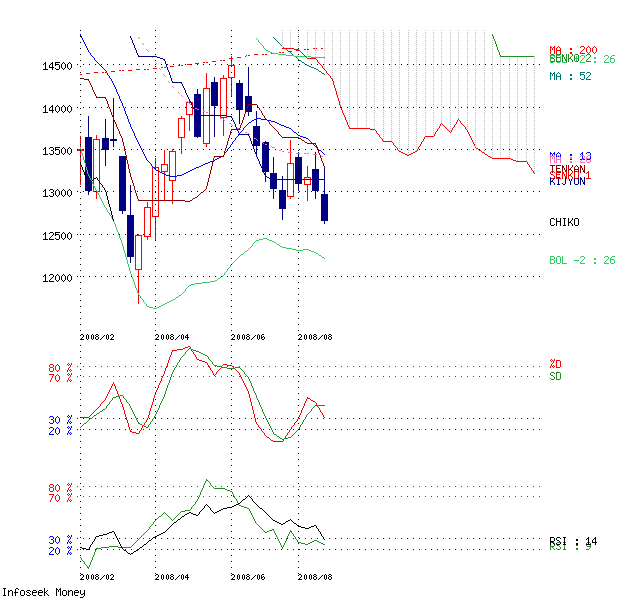 2008/08/23 - トロンボーンさんの株式ブログ。タイトル:「チャート分析-日経平均株価」 本文:◇日経平均株株価(日足) ・株価はボリバンのかげんに来てるため、下方バイアスに達成感があり、ストキャスも%Dが20を割り込み割安感があるので、月曜はCMEの分は上げて始まる事が考えられる。