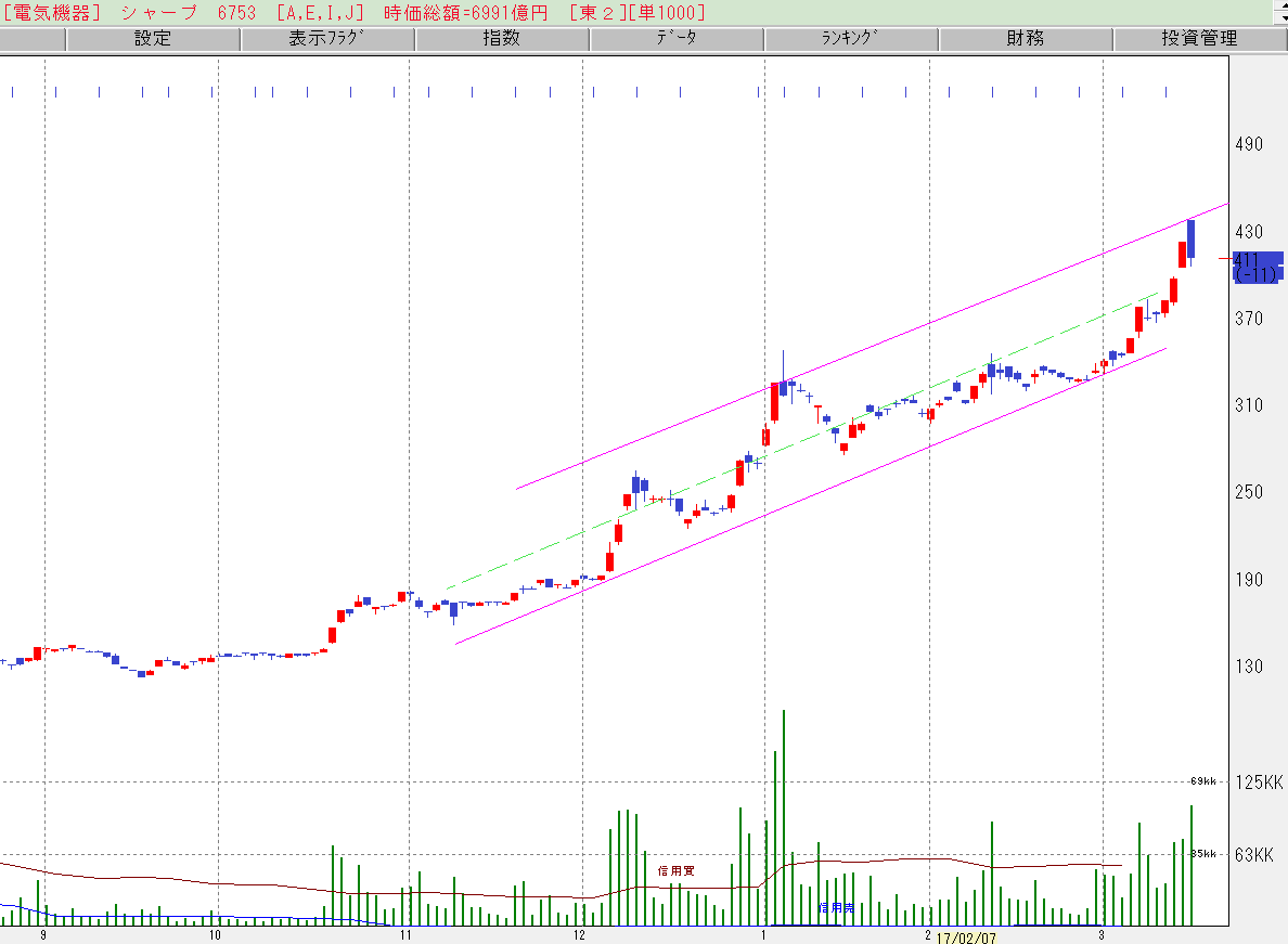 昨日3月15日のシャープ、トレンドライン上限で綺麗に陰線。