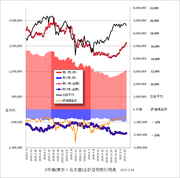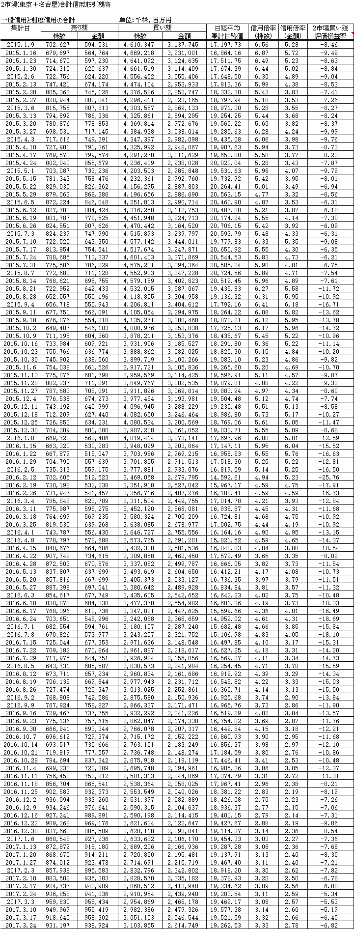 で、3/24現在の信用取引残高のグラフです。売り残は株数で少し増加、金額では少し減少。買い残はともに増加しています。
