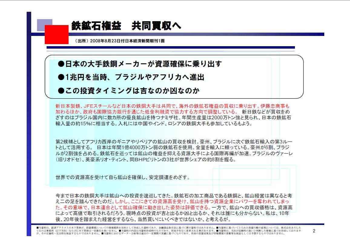 2008/08/26 - 木下 晃伸さんの株式ブログ。タイトル:「【投資脳のつくり方】鉄鉱石権益 共同買収へ」 本文:みなさま、いかがお過ごしでしょうか。 経済アナリスト、木下 晃伸(きのした てるのぶ)です。 ●仲間を作ること 独立して約半年が経過しました。