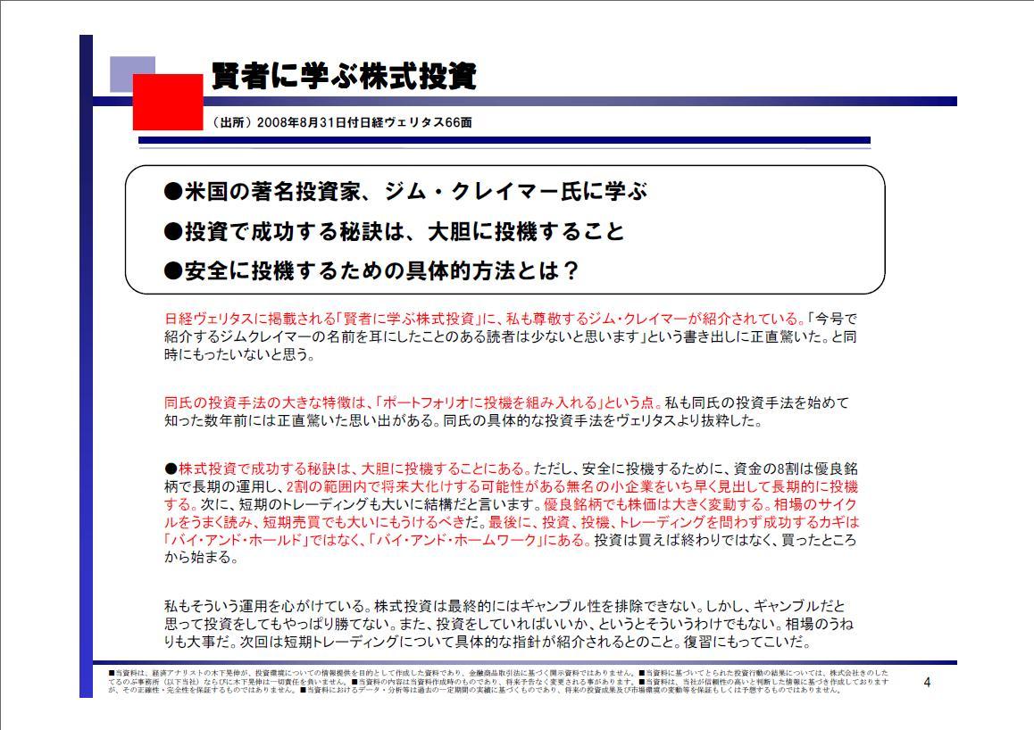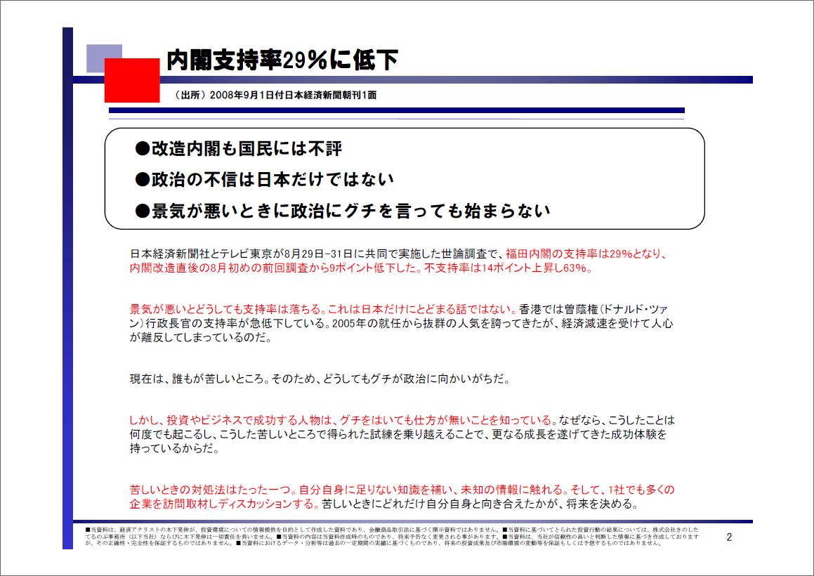 2008/09/02 - 木下 晃伸さんの株式ブログ。タイトル:「【投資脳のつくり方】内閣支持率29%に低下」 本文:みなさま、いかがお過ごしでしょうか。 経済アナリスト、木下 晃伸(きのした てるのぶ)です。 ●9月 多くの企業が中間決算を迎えるタイミングです。