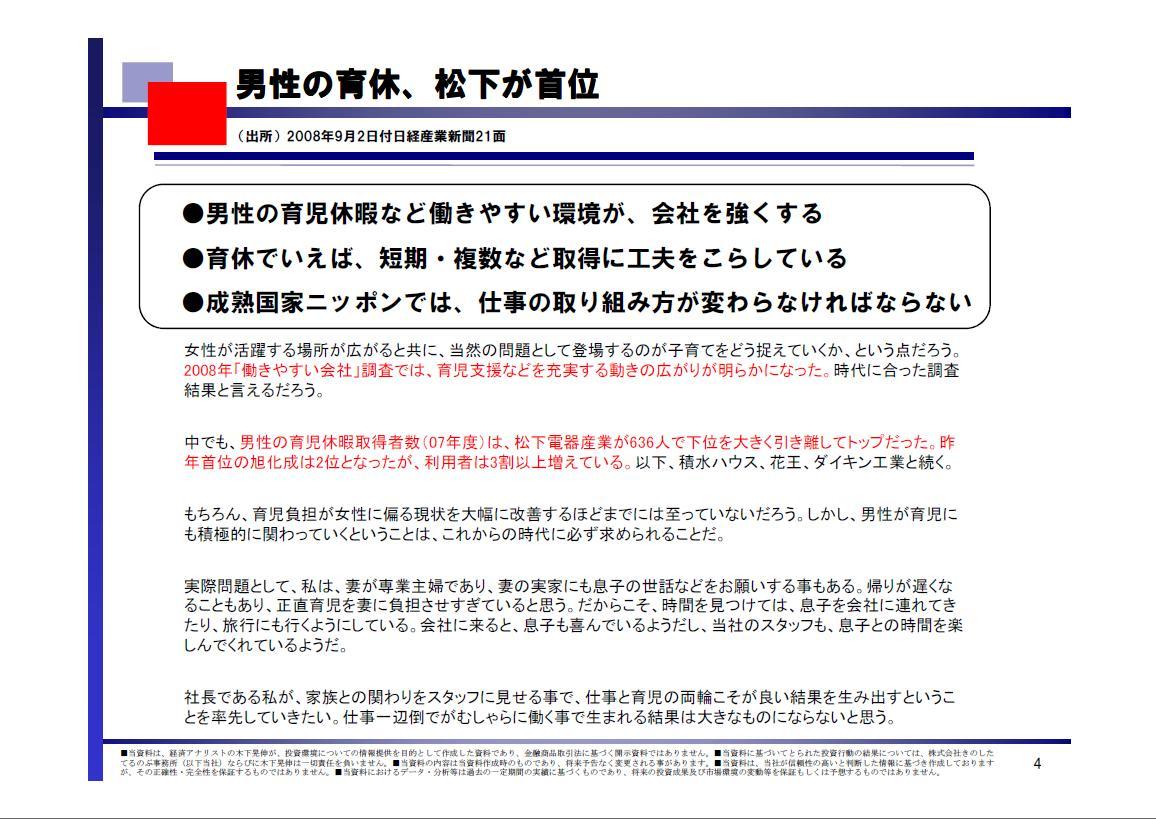 2008/09/03 - 木下 晃伸さんの株式ブログ。タイトル:「【投資脳のつくり方】福田首相、辞任表明」 本文:みなさま、いかがお過ごしでしょうか。 経済アナリスト、木下 晃伸(きのした てるのぶ)です。 ●育児休暇 厚生労働省の外郭団体である、財団法人21世紀職業財団の調査で、